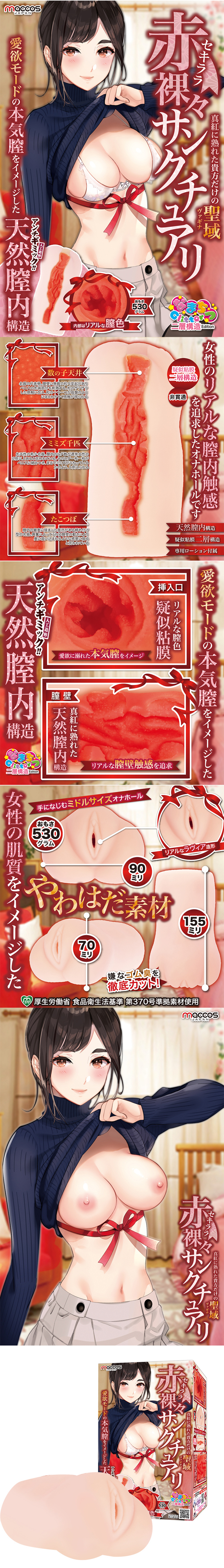 雙層構造,內層使用了黏膜素材,入口是小肉粒,中段是螺旋紋,收尾是極窄子宮口,材質偏軟,是名副其實的「真正女性感覺」。