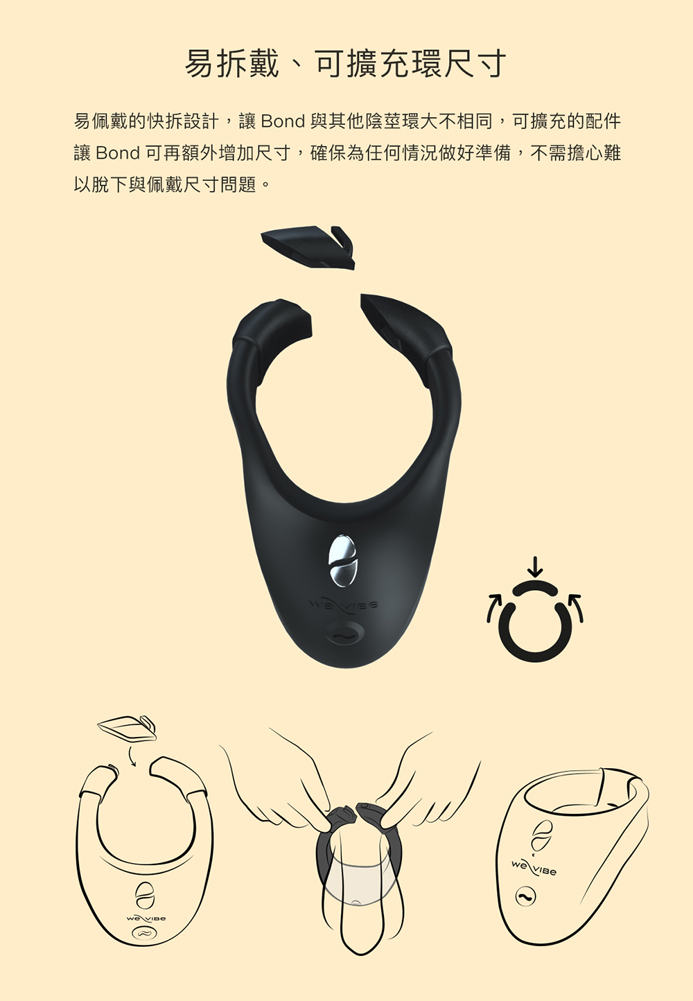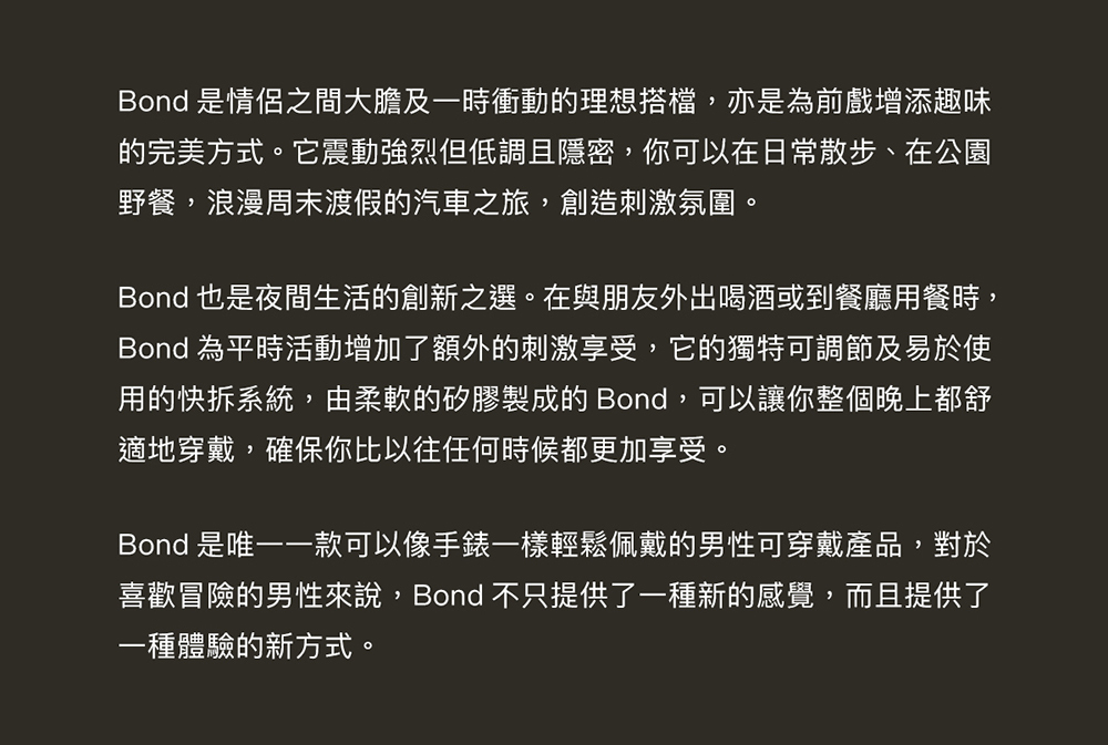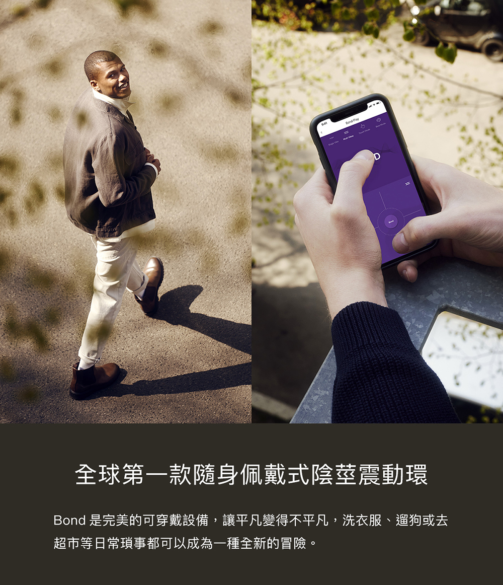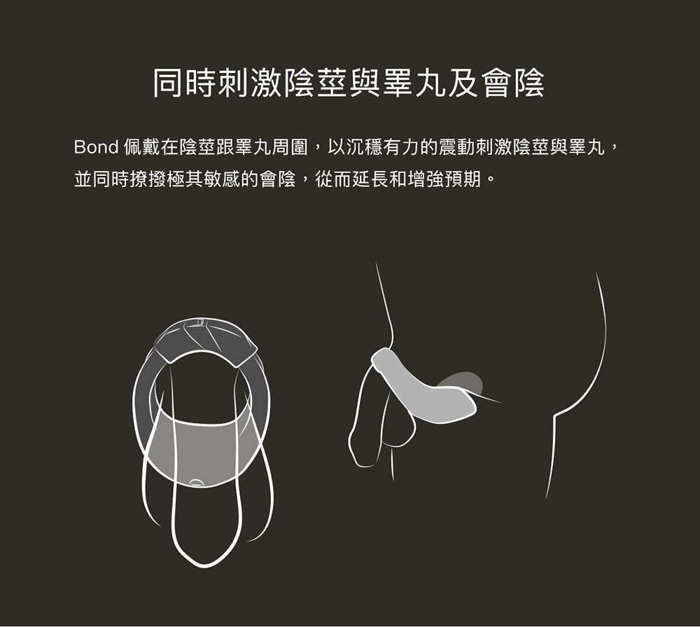 Bond適合隨身攜帶,佩戴包覆陰莖與睪丸,自訂強度,沈穩的震動同時刺激會陰