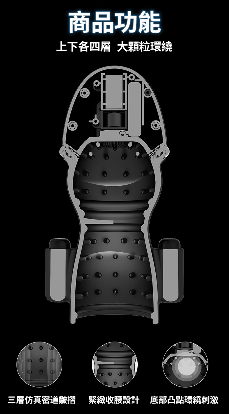 上下各4層大顆粒環繞,三層仿真蜜皺揩、底部凸點環繞刺激