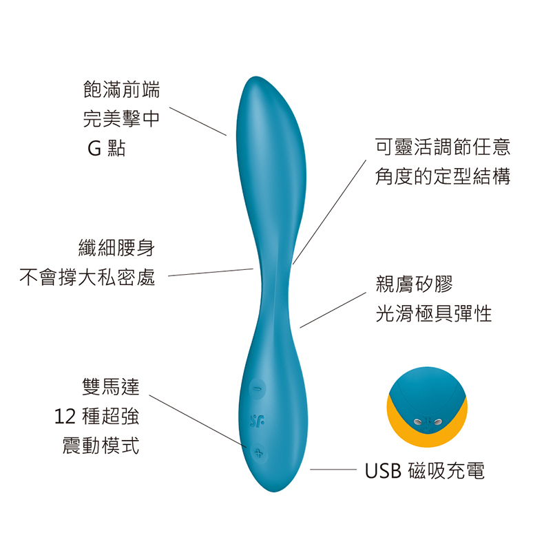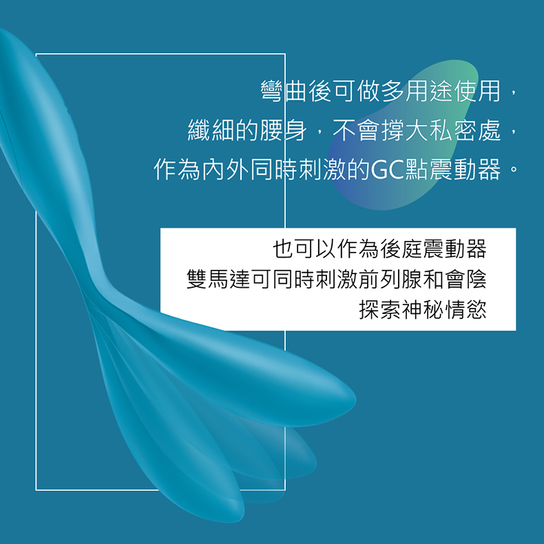 彎曲後可做多用途使用,纖細的腰身,不會撐大私密處,作為內外同時刺激的GC點震動器,也可以作為後庭震動器,雙馬達可同時刺激前列腺和會陰,探索神秘情慾。