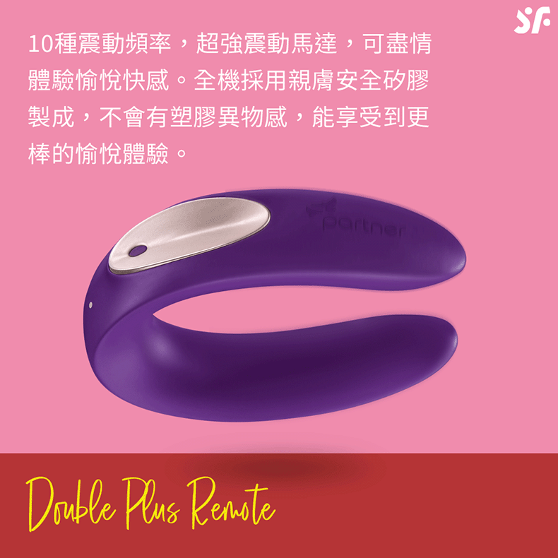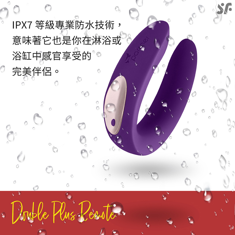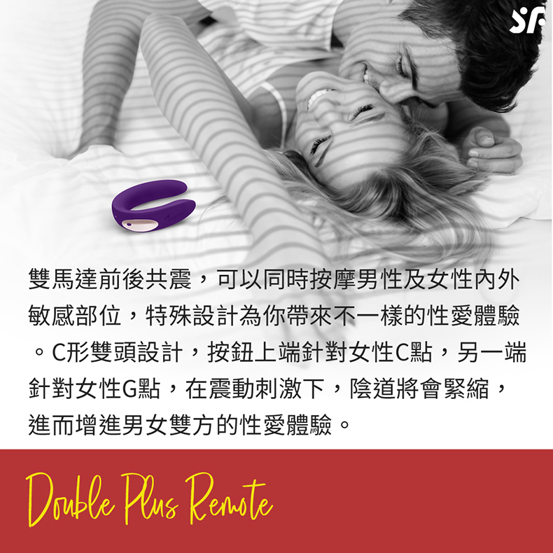 Satisfyer遙控雙人共震器親密共震、同步愉悅。附有遙控器雙人共震器,更易操作與更換模式。雙馬達前後共震,可以同時按摩男性及女性內外敏感部位,特殊設計為你帶來不一樣的性愛體驗。C 型雙頭設計,按鈕上端針對女性 C 點,另一端針對女性 G 點,在震動刺激下,陰道將會緊縮,進而增進男女雙方的性愛體驗。10種震動頻率,超強震動馬達,可盡情體驗愉悅快感。 IPX7防水等級,在水中也可安心使用,更能體驗到水中震頻,所帶來的刺激享受。全機採用親膚安全矽膠製成,不會有塑膠異物感,能享受到更棒的愉悅體驗。