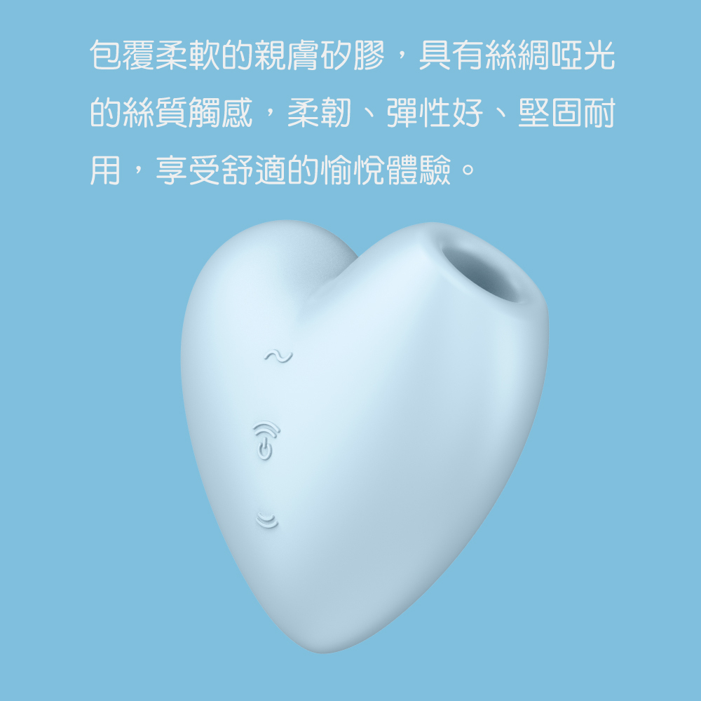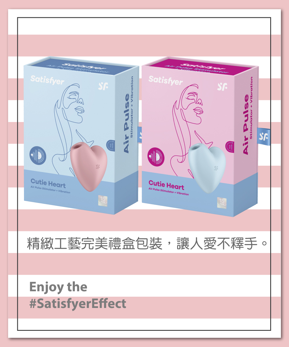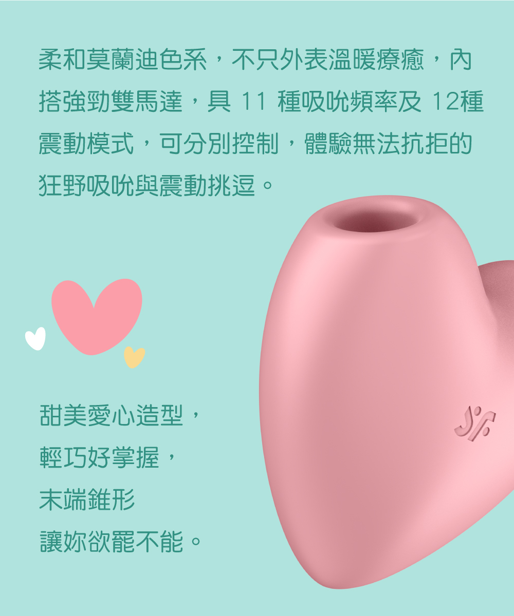 Cutie Heart 是 Satisfyer 革命性的吸吮陰蒂震動器,非接觸性 Air Pulse 技術,以輕柔氣壓刺激陰蒂。寬大柔軟吸吮頭完美包覆陰蒂,同時開啟強烈震動,帶來無與倫比的高潮體驗。柔和莫蘭迪色系,不只外表溫暖療癒,內搭強勁雙馬達,具 11 種吸吮頻率及 12種震動模式,可分別控制,體驗無法抗拒的狂野吸吮與震動挑逗。甜美愛心造型,輕巧好掌握,末端錐形可針對敏感點刺激,讓妳欲罷不能。包覆柔軟的親膚矽膠,具有絲綢啞光的絲質觸感,柔韌、彈性好、堅固耐用,享受舒適的愉悅體驗。具 IPX7 等級專業防水技術, 是潮濕和狂野樂趣的理想伴侶,可以在淋浴或浴缸中玩樂,在水下,吸啜感更加強烈!靜音馬達與 USB 磁吸式充電,亦方便隨身攜帶使用。精緻的訂製禮盒,充滿儀式感,送給最愛的自己,也適合送給好閨蜜。