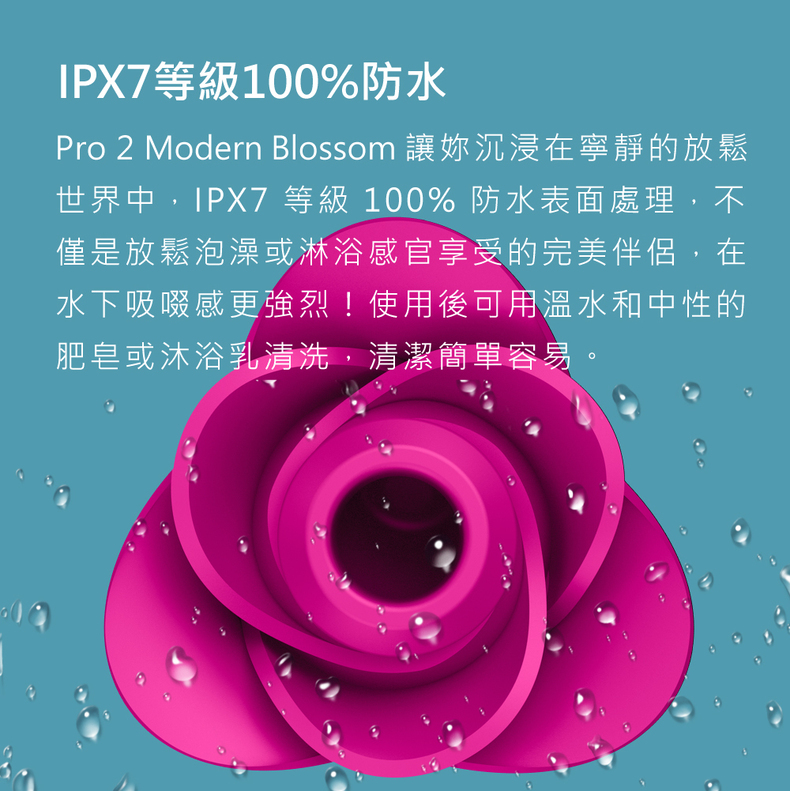 IPX7 等級100%防水,Pro 2 Modern Blossom 讓妳沉浸在寧靜的放鬆世界中,IPX7 等級 100% 防水表面處理,不僅是放鬆泡澡或淋浴感官享受的完美伴侶,在水下吸啜感更強烈!使用後可用溫水和中性的肥皂或沐浴乳清洗,清潔簡單容易。