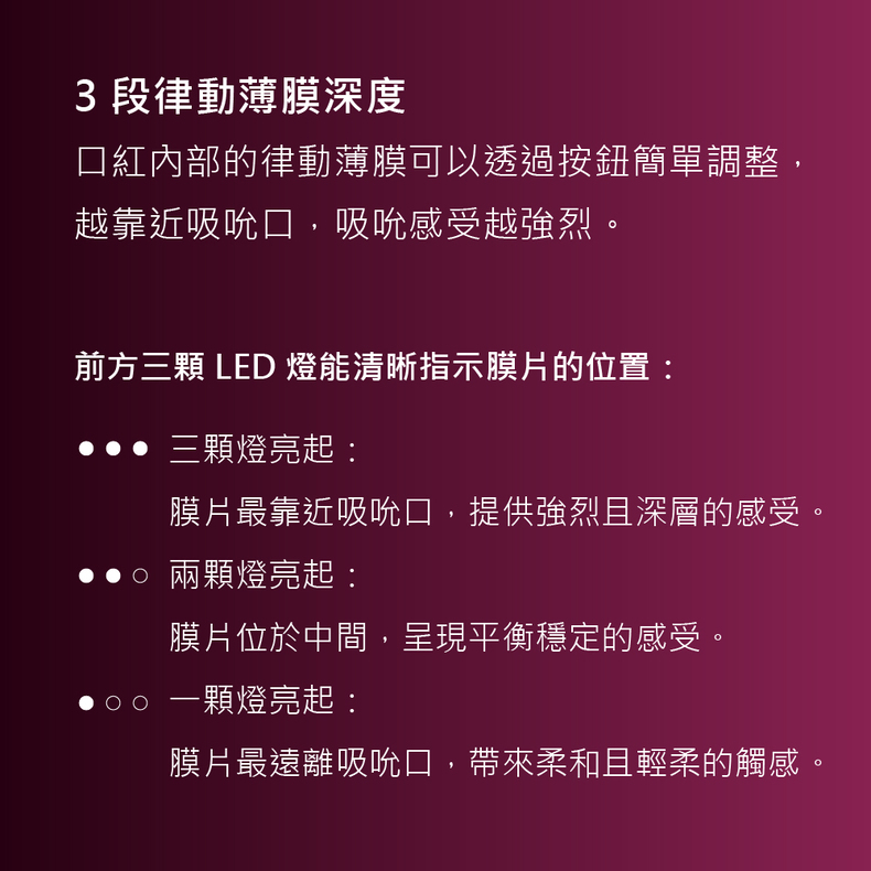 全新 Pro 2 Kiss 搭載 3D 磁感律動馬達,隱身於口紅造型,完美貼合掌心,非常適合旅行攜帶,完美融合創新技術與優雅設計。