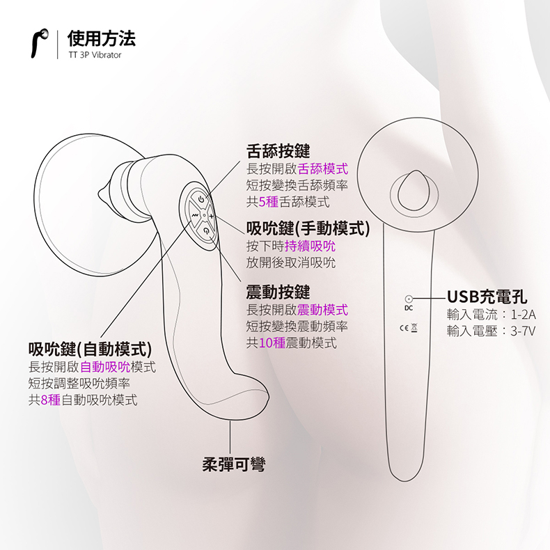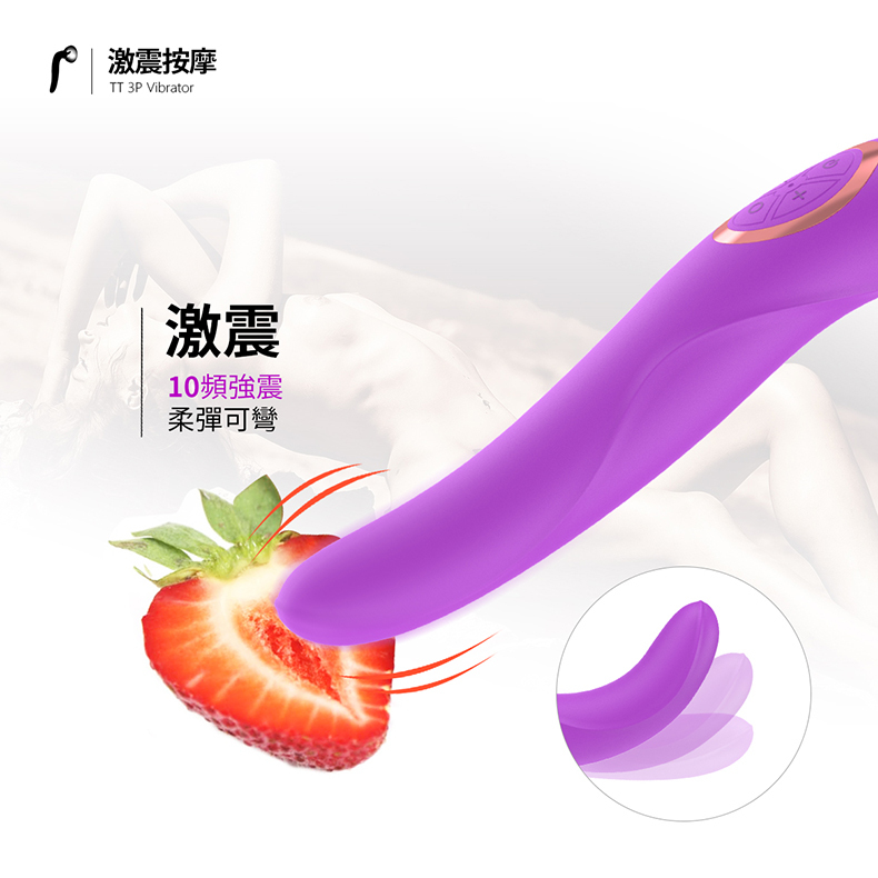 最底端的可彎曲是電動按摩棒,三位一體的設計並沒有降低其震動的力道,經過前面兩種強大功能的挑逗,最後以強震按摩棒抽插收尾,TT3P絕對能帶給你前所未有的全面高潮!