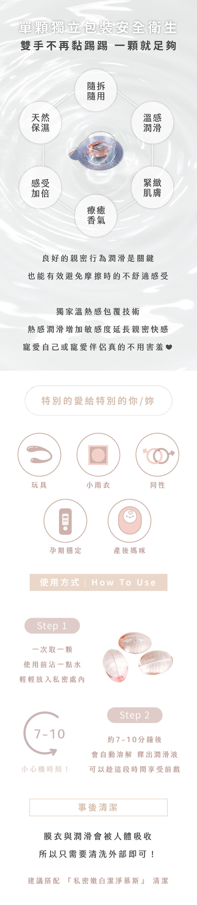 用法:使用時只要取一顆沾水,將膠囊放入秘境內,大約5-7分鐘後,膜衣會溶解釋出潤滑液。
