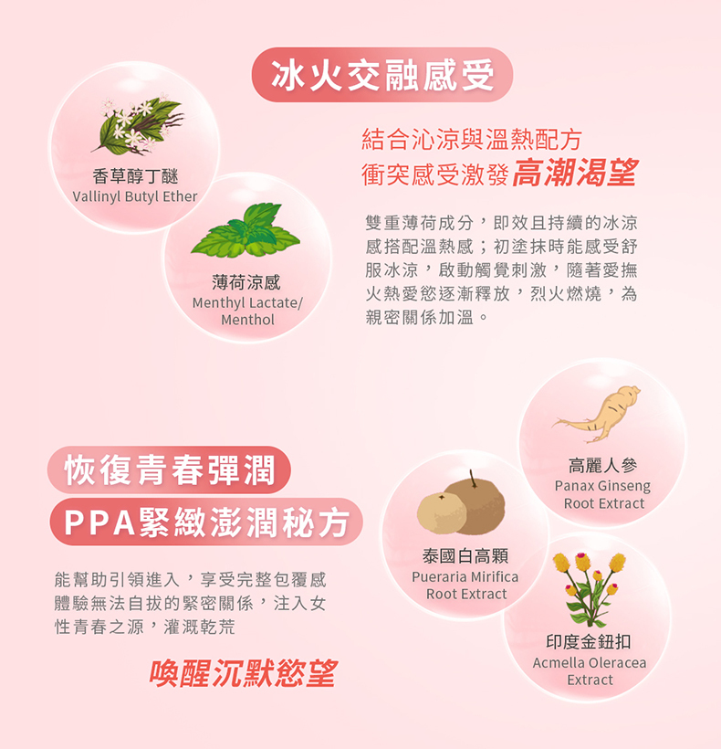 獨特PPA特殊成分,源自秘方研究開發,緊緻澎潤、放大感官敏度,啟動性感魅力