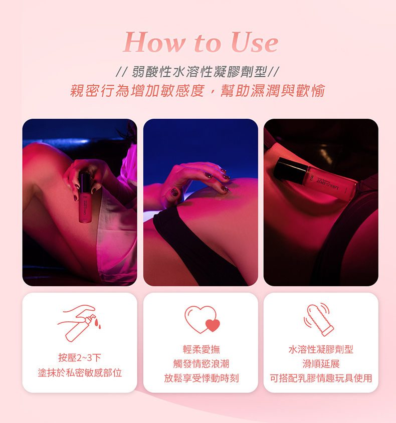 使用方法:按壓2~3下,塗抹於私密敏感部位,輕柔愛撫,放鬆享受悸動時刻,水溶性凝膠劑型滑順延展,可搭配乳膠情趣玩具使用