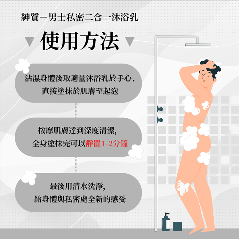 使用方法:沾濕身體,取適量沐浴乳至手心上,直接塗抹於肌膚至起泡,在略加按摩達到深度清潔,全身塗抹完可以靜置1-2分鐘,再以清水洗淨