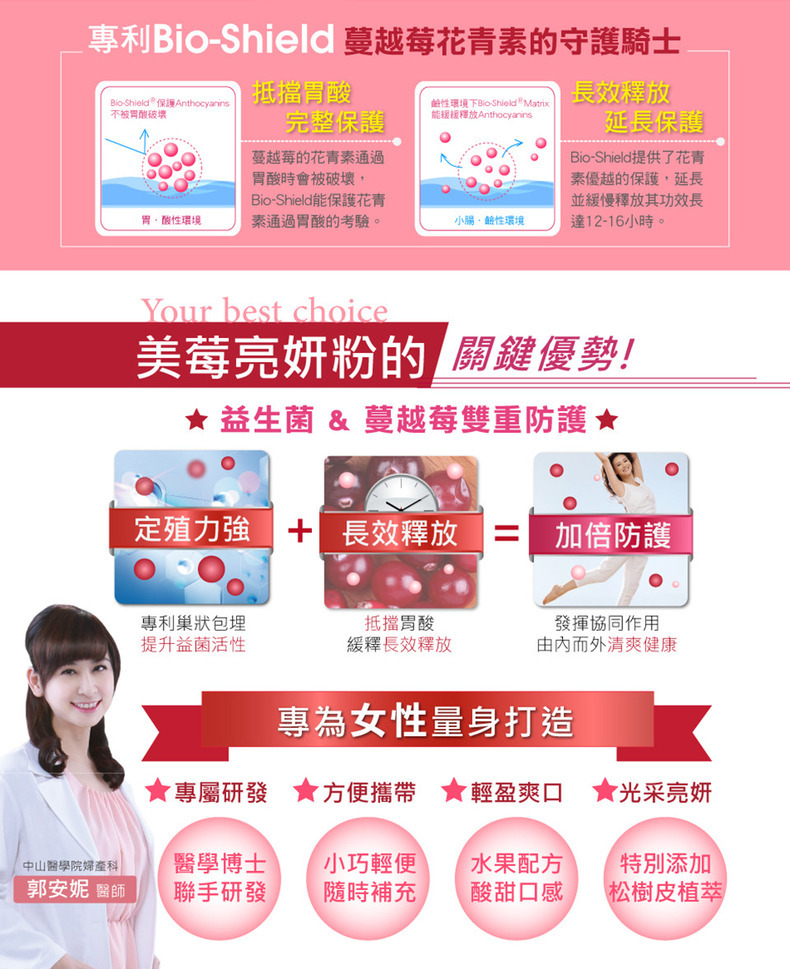 主要成分:乳糖、麥芽糊精、蔓越莓粉、益生菌:Lactobacillus casei 乾酪乳桿菌(C菌)、Lactobacillus acidophilus 嗜酸乳桿菌(A菌)蔗糖、紅葡萄果